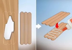 Dengan menempelkan stik es krim pada sisi kayu yang tidak terlihat atau bagian dalam lubang, proses perbaikan lubang pada kayu dapat dilakukan dengan lebih mudah dan menghasilkan hasil yang lebih baik.